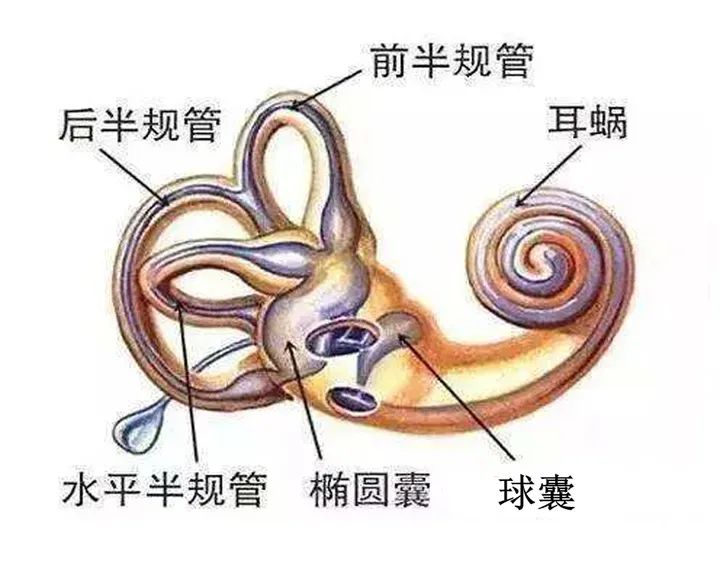 咱们两个耳朵的深处各有一个感受器,它由三管两囊构成,三管是指三个半规管(前半规管、后半规管、水平半规管),两囊是指球囊和椭圆囊。它是这个姿色的: